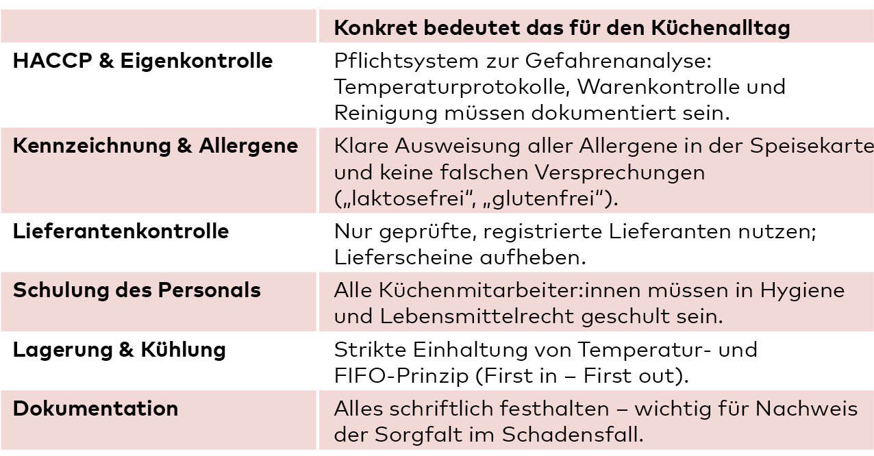 Wichtig: Verschulden muss bei Produkthaftung nicht nachgewiesen werden! Schon der Schaden durch ein fehlerhaftes Produkt reicht.3. Welche Pflichten haben Köch:innen und Betriebe?